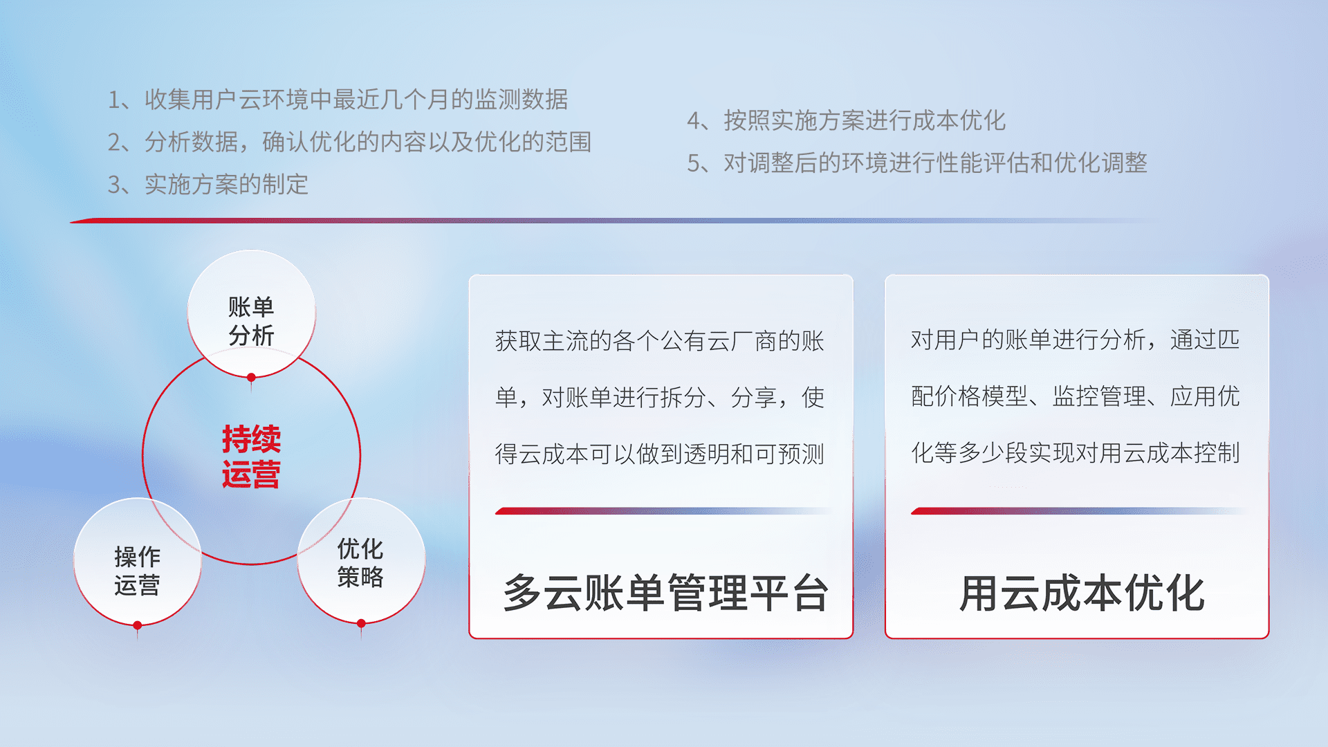 通过多云纳管,,,,以统一的资源数据模型把客户的云资源进行抽象和封装,,进而实现对多云资源的统一操作,,,保障云资源管理的可靠性、、稳定性与可用性。。。量身定制化运维内容,,,,配置、、开发运维、、补丁管理、、备份、、监控、、、认证和访问管理、、审计和日常巡检等,,,,保障在用云过程中的可靠度,,稳定度以及高可用率。。。