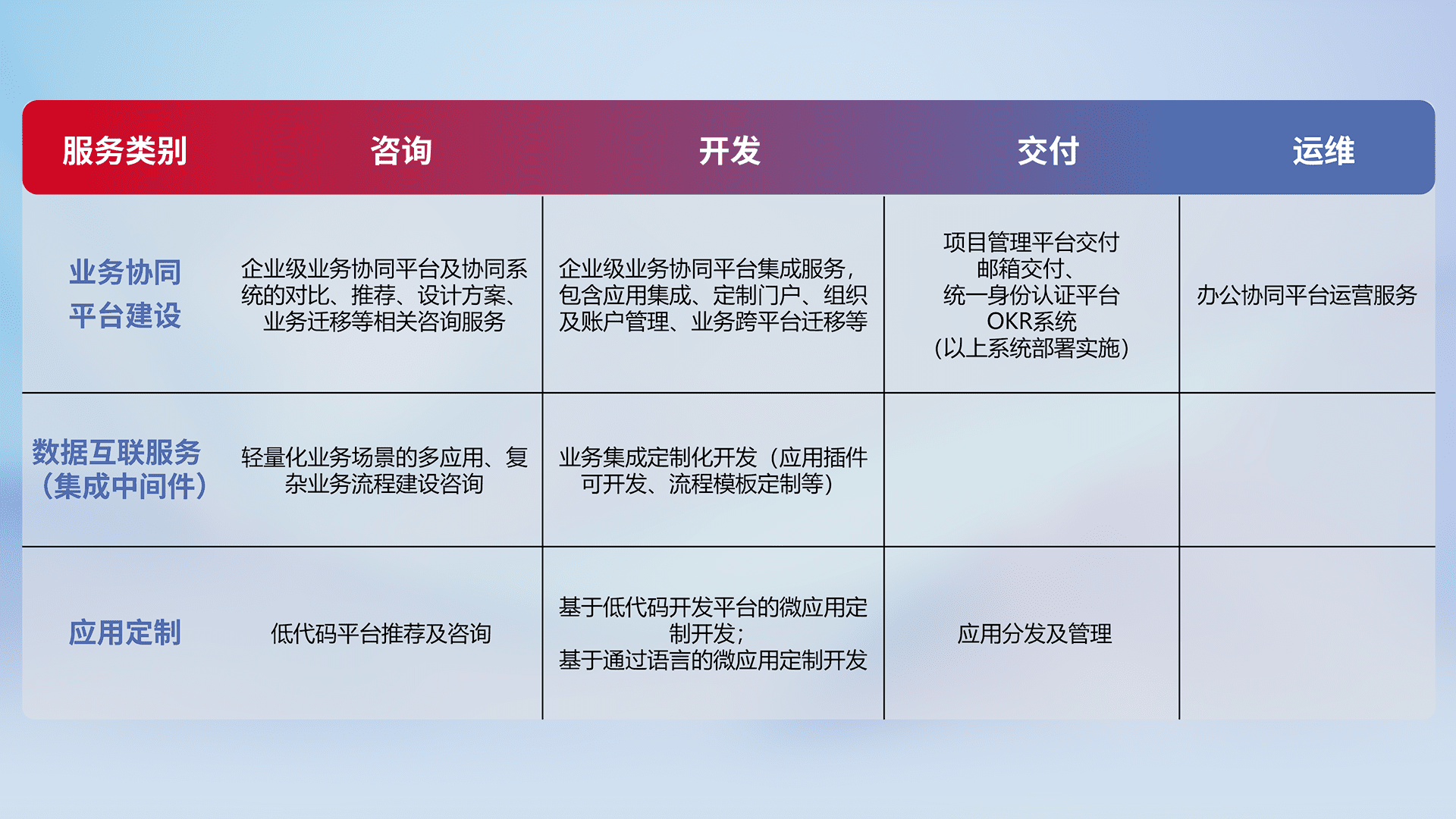 针对钉钉、、、、企微、、IDaas等平台级产品提供产品的规划、、、、方案、、交付、、、、定制化开发等服务,,实现如统一协同办公、、、、智能客户服务、、、混合会议管理、、、智能数据查询、、等业务场景,,,实现数字化转型。。